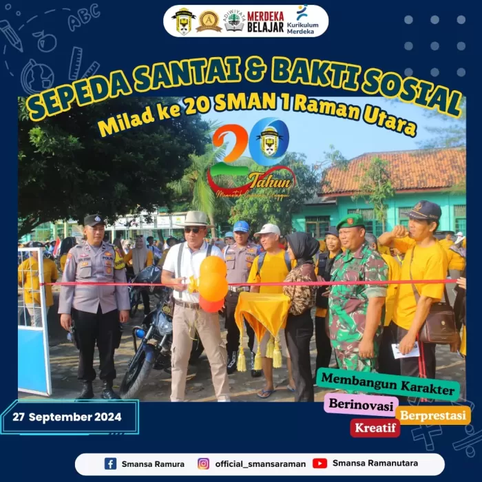 Pagi ini, Jumat, 27 September 2024 . SMAN 1 Raman Utara, mengadakan kegiatan bersepeda santai sebagai salah satu bentuk perayaan milad ke-20 SMAN 1 Raman Utara. Bersama dengan bapak kepala sekolah, bapak dan ibu guru, berserta siswa siswinya juga turut serta dalam meramaikan kegiatan ini.